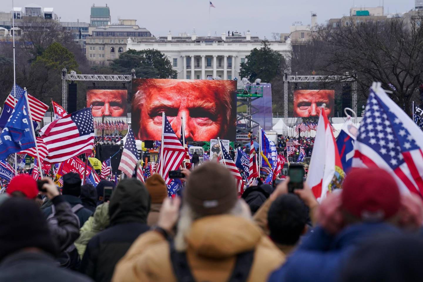 The face of Donald Trump appears on large screens as his supporters prepare to make their way to the Capitol to riot on January 6, 2021. Photo / AP