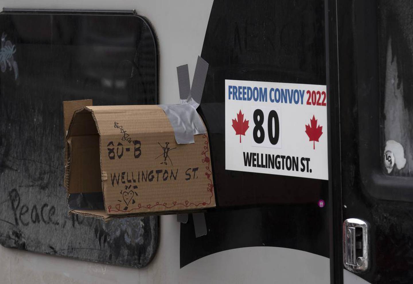 A cardboard mailbox is taped to the side of a camper being used in protests against COVI-19 mandates. Photo / APÂ