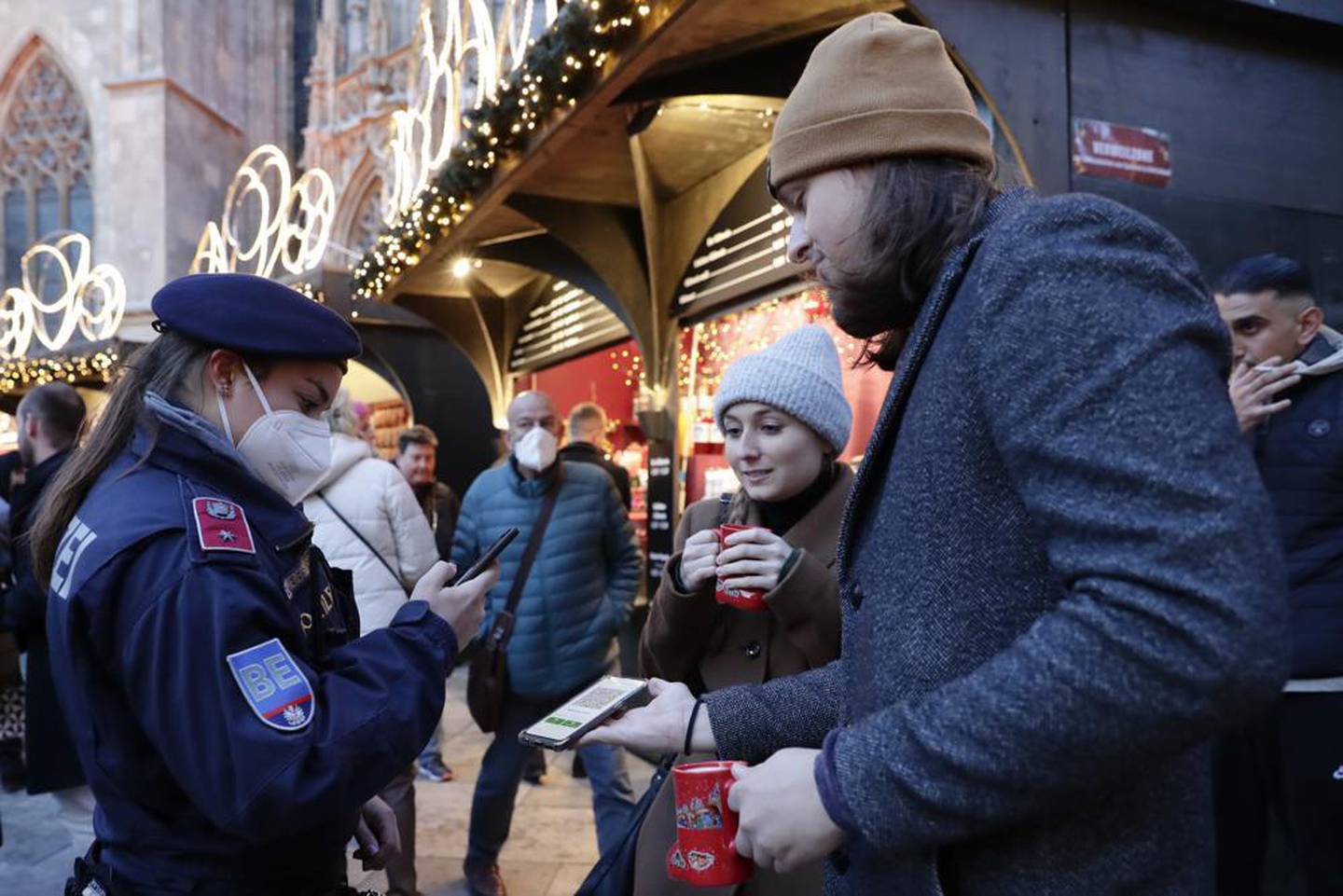 A police officer checks the vaccination status of visitors during a patrol on a Christmas market in Vienna, Austria on Friday, November 19. Photo / AP