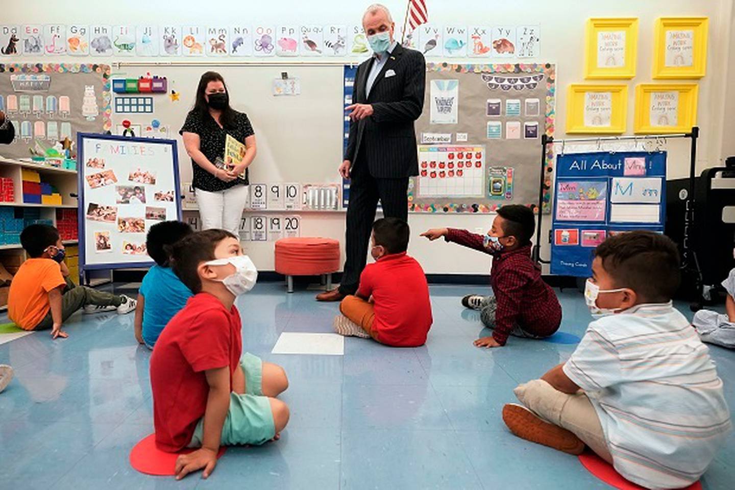 New Jersey Govenor Phil Murphy talks to three- and four-year-old students in a pre-K class at the Dr. Charles Smith Early Childhood Center. Photo / APÂ