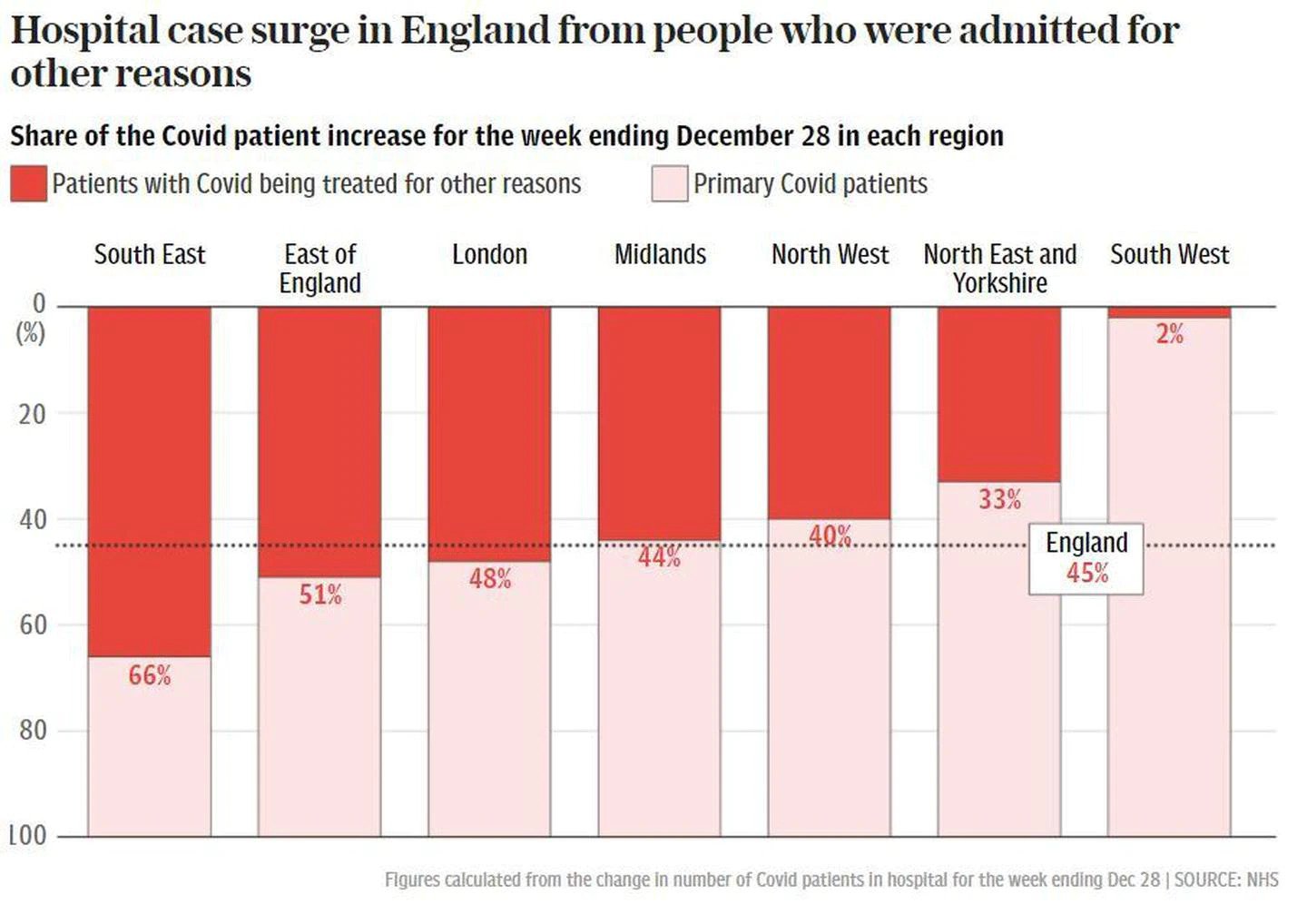 There were 13,045 people included in the official Covid hospital figures by January 4, but 4825 had been admitted for other reasons. Across the country, 37 per cent of Covid hospital patients were admitted for other reasons, compared with a figure of 24 per cent earlier this month.Â