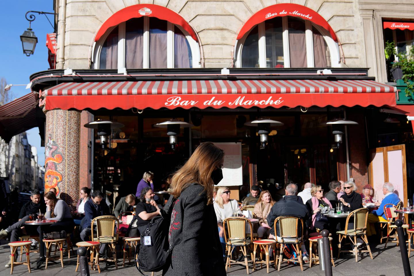 A woman wearing a face mask walks in front of an open Parisian cafe on March 14. Photo / APÂ