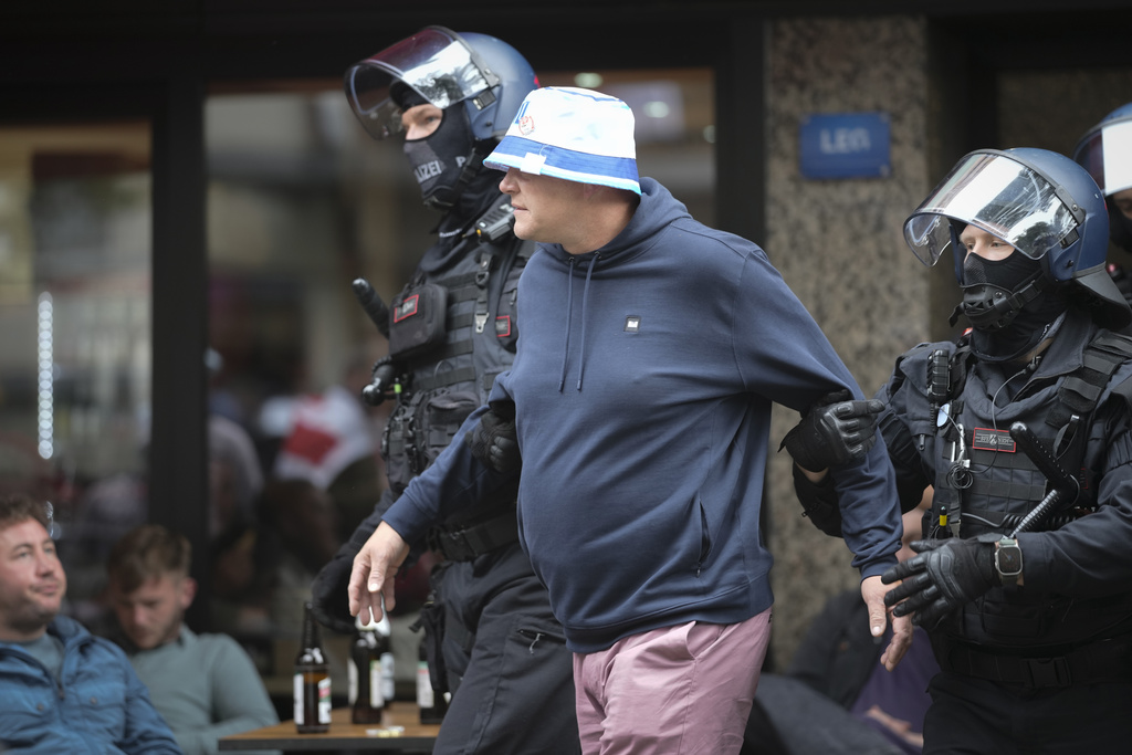 Police detain an England soccer fan ahead the Group C match between Serbia and England at the Euro 2024 soccer tournament in Gelsenkirchen, Germany, Sunday, June 16, 2024. (AP Photo/Markus Schreiber)