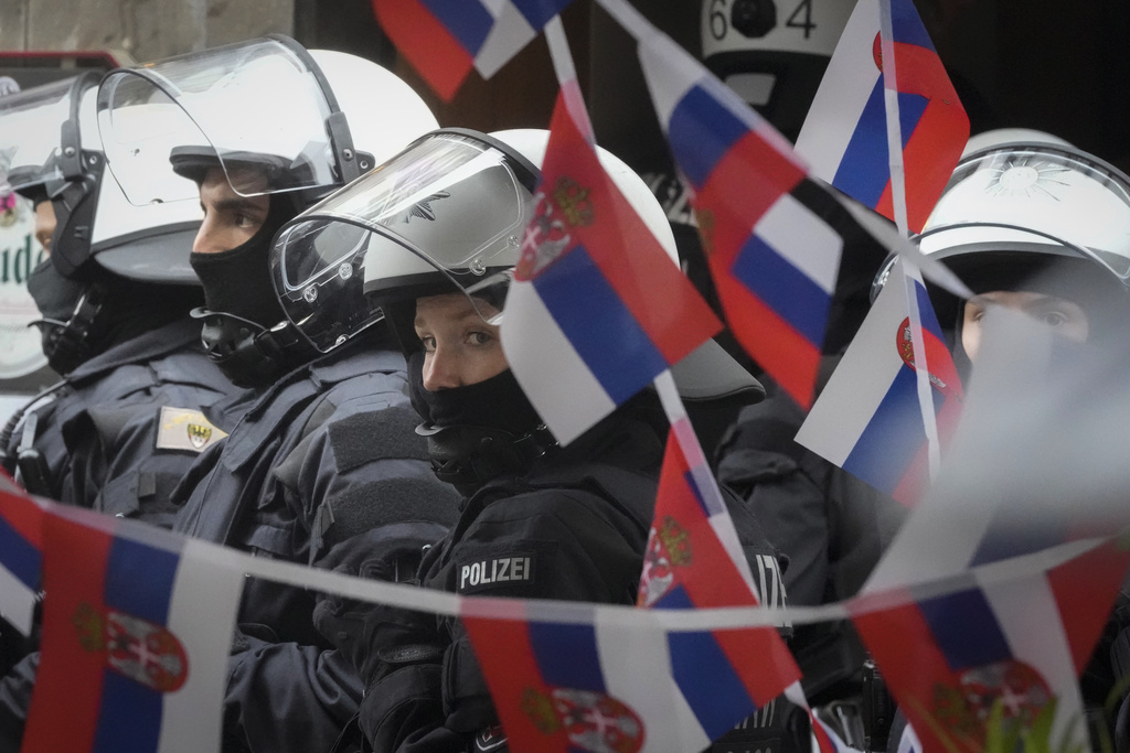 Police stand next to a restaurant decorated with Serbian flags ahead the Group C match between Serbia and England at the Euro 2024 soccer tournament in Gelsenkirchen, Germany, Sunday, June 16, 2024. (AP Photo/Markus Schreiber)