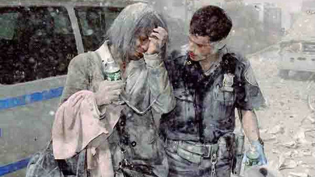 Police officer Mike Brennan helps a distraught woman only known as Beverly, as ash and debris cover the area following the collapse of 1 World Trade Center. (Photo / Getty / Corey Sipkin)