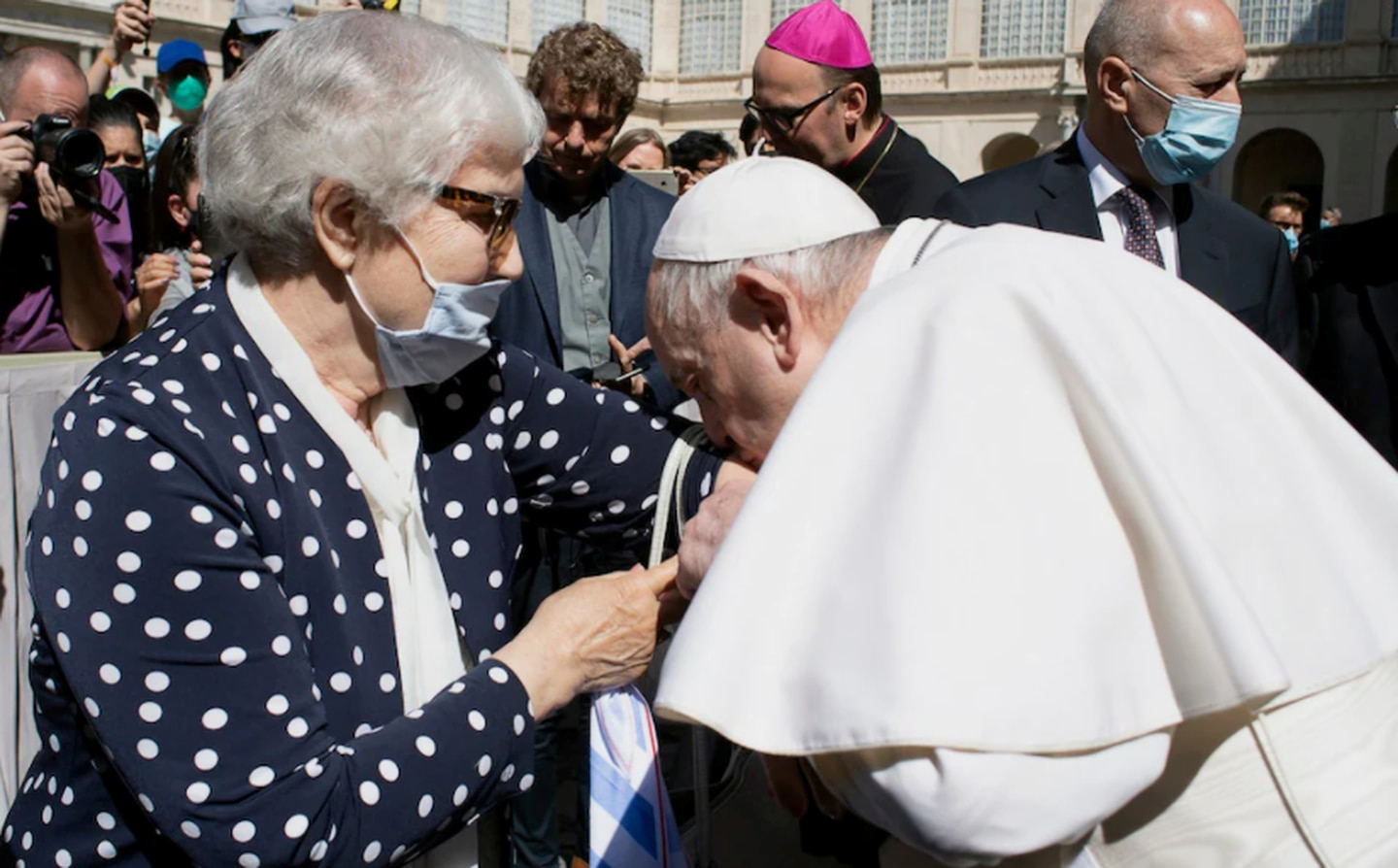 Pope Francis kisses the Auschwitz serial number tattoo on the arm of Holocaust survivor Lidia Maksymowicz. (Photo / Vatican Media)