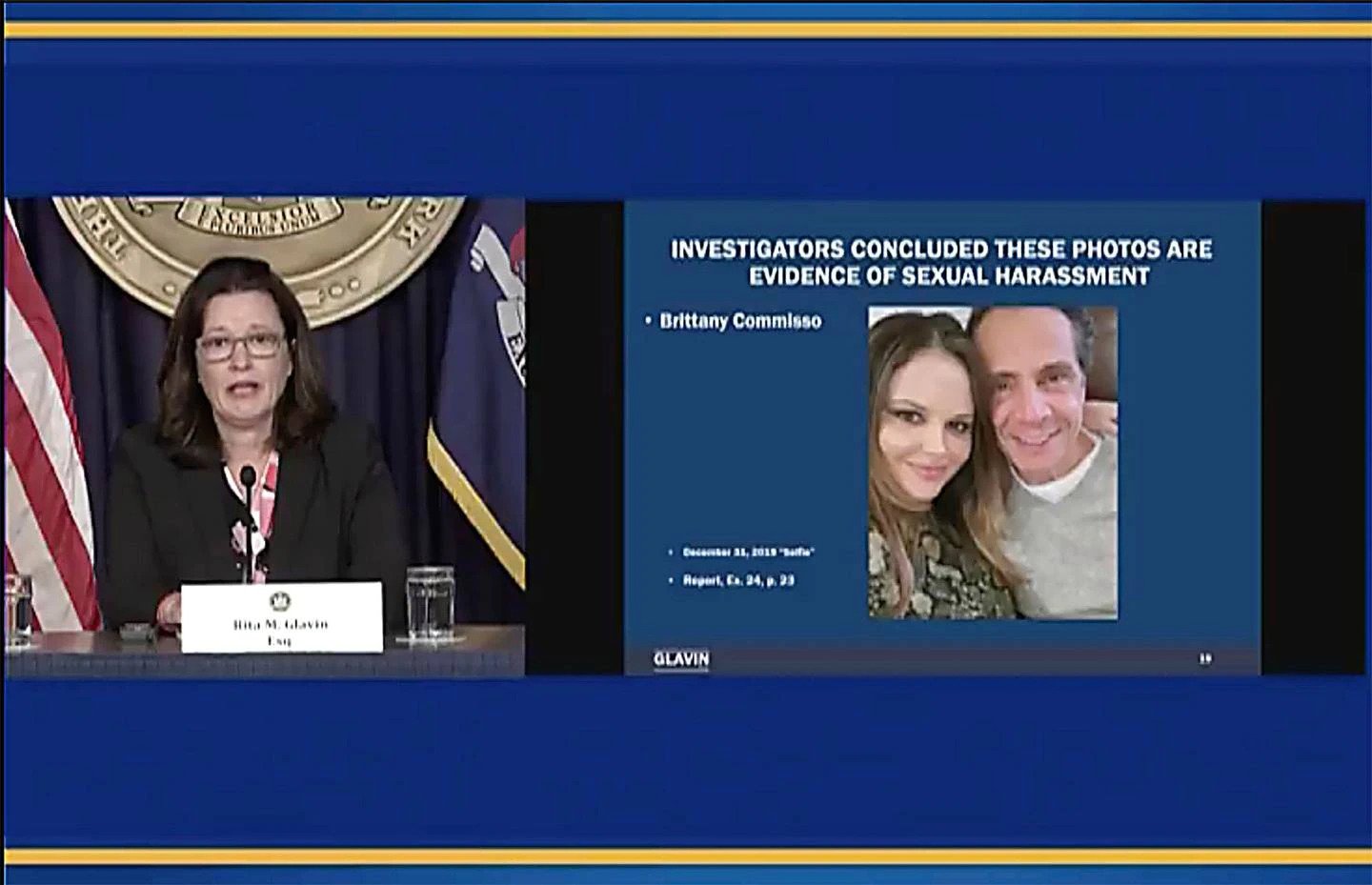 Rita Glavin, attorney for former Governor Andrew Cuomo, speaks alongside a photo of Brittany Commisso, an executive assistant to Cuomo. Photo / Office of the Governor of New York via AP, FileÂ