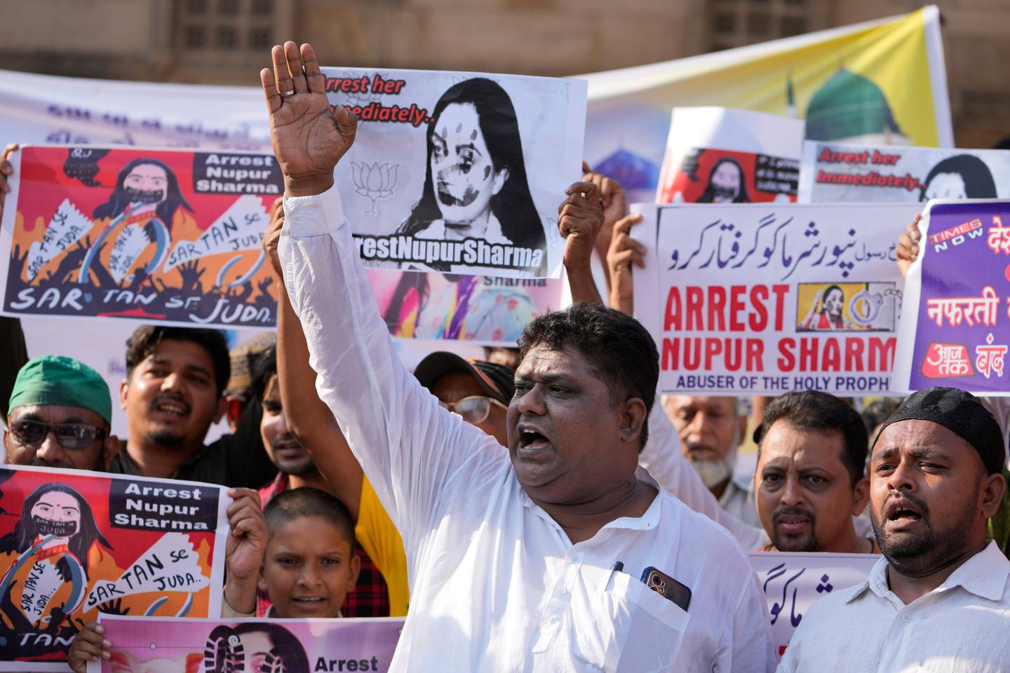 Indian Muslims hold placards demanding the arrest of Nupur Sharma, a spokesperson of the governing Hindu nationalist party, as they react to the derogatory references to Islam. Photo / AP