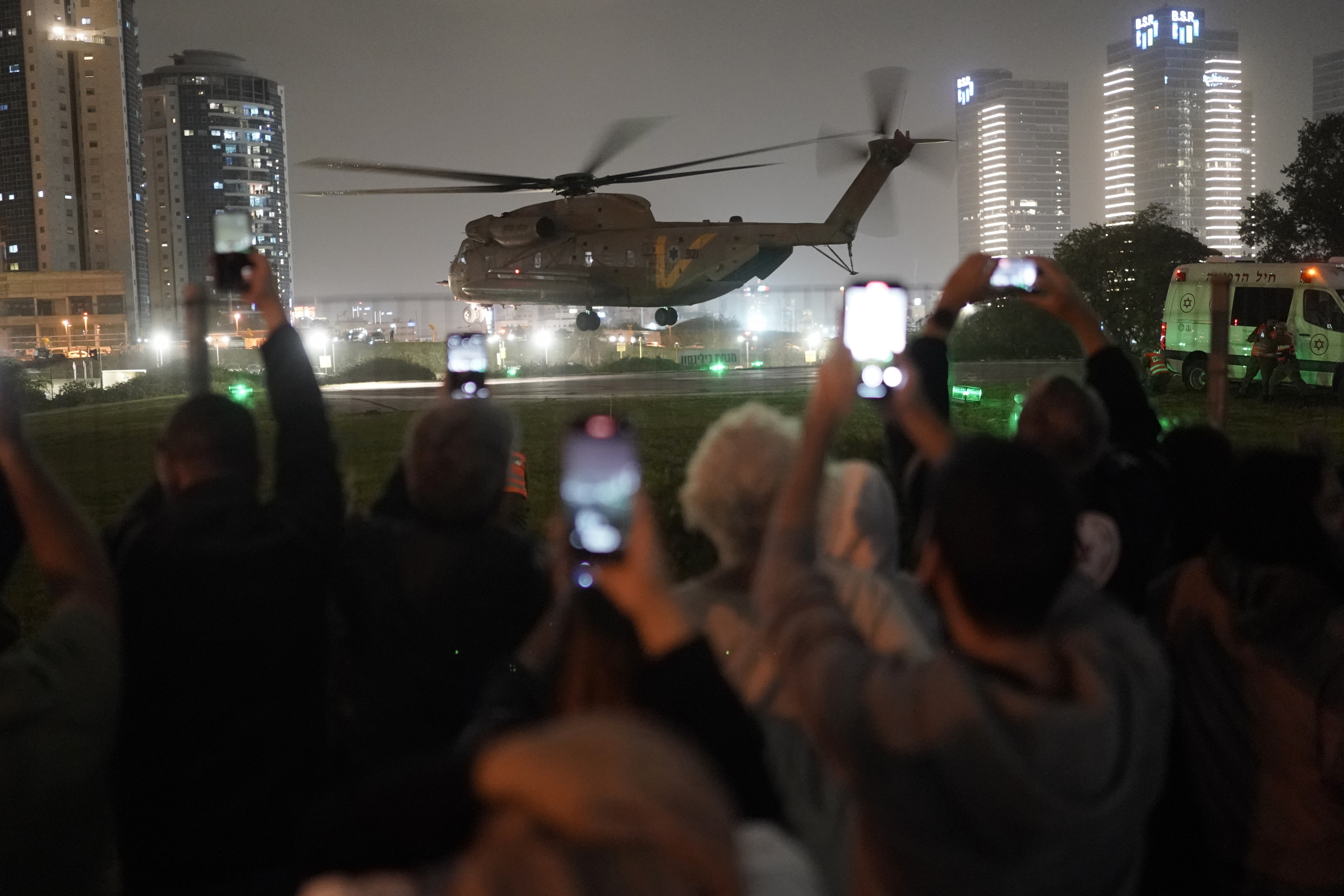 A group of Israelis watch as a helicopter carrying hostages released from the Gaza Strip lands at the helipad of the Schneider Children's Medical Center in Petah Tikva, Israel, Sunday Nov. 26, 2023. Photo / AP