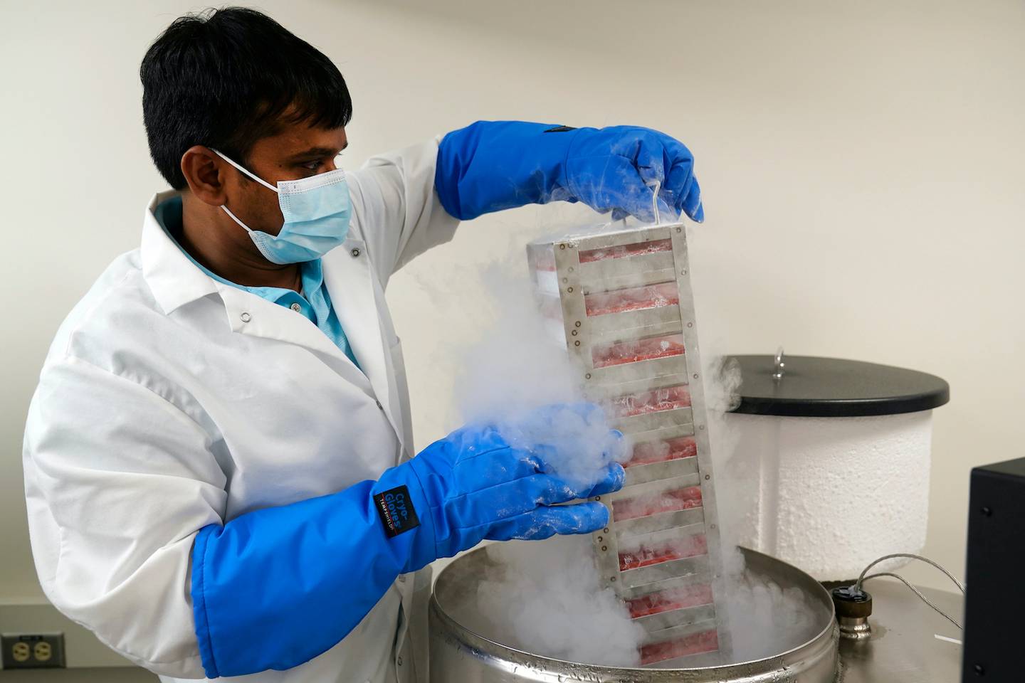 Researcher Dr Ramachandran Prakasam pulls stem cells out of a nitrogen tank used in the study of a rare form of autism linked to a genetic mutation in the MYT1L gene. Photo / APÂ