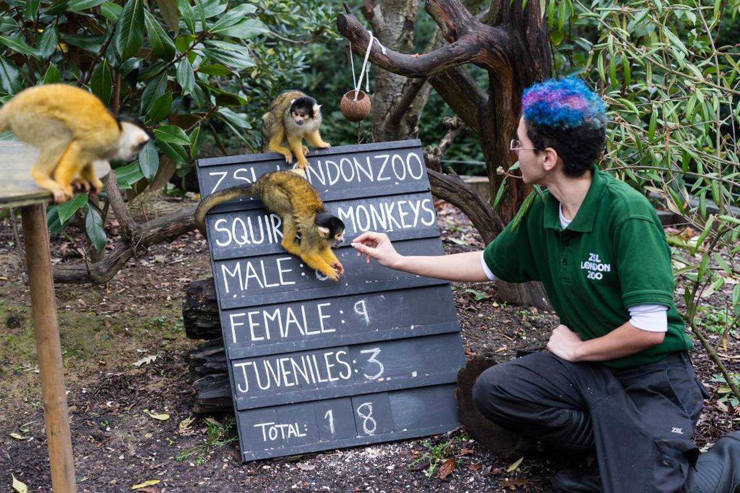 A zookeeper counts the squirrel monkeys during the annual stocktake at ZSL London Zoo. Photo / Getty ImagesÂ