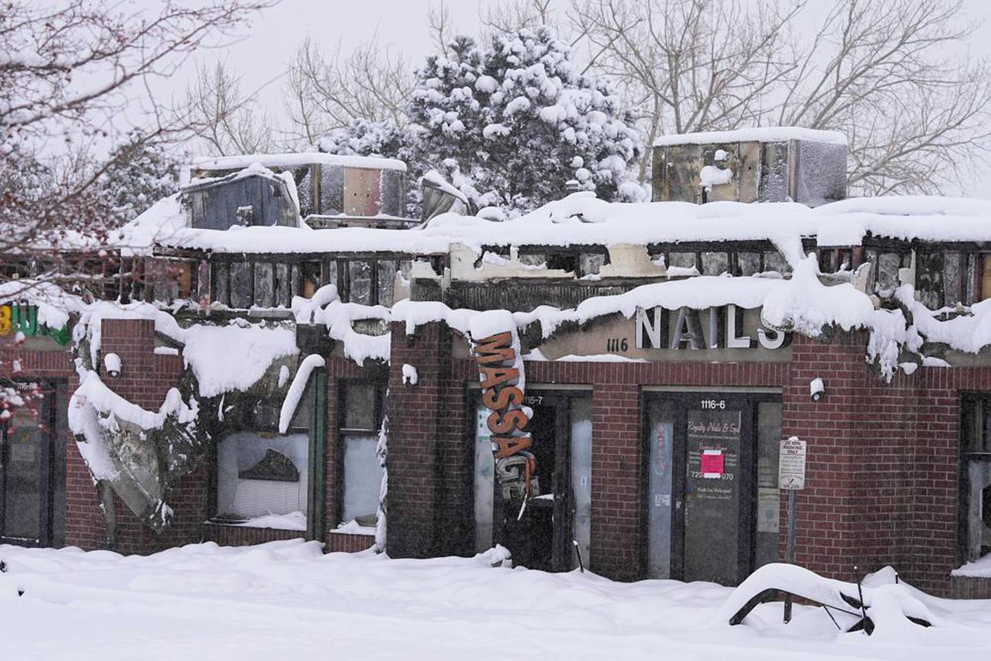 Snow covers the burned remains of a shopping center after the Marshall Wildfire in Louisville, Colorado. Photo / AP