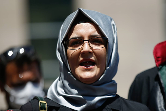 Hatice Cengiz, the fiancee of slain journalist Jamal Khashoggi, talks to members of the media in Turkey. Photo / AP