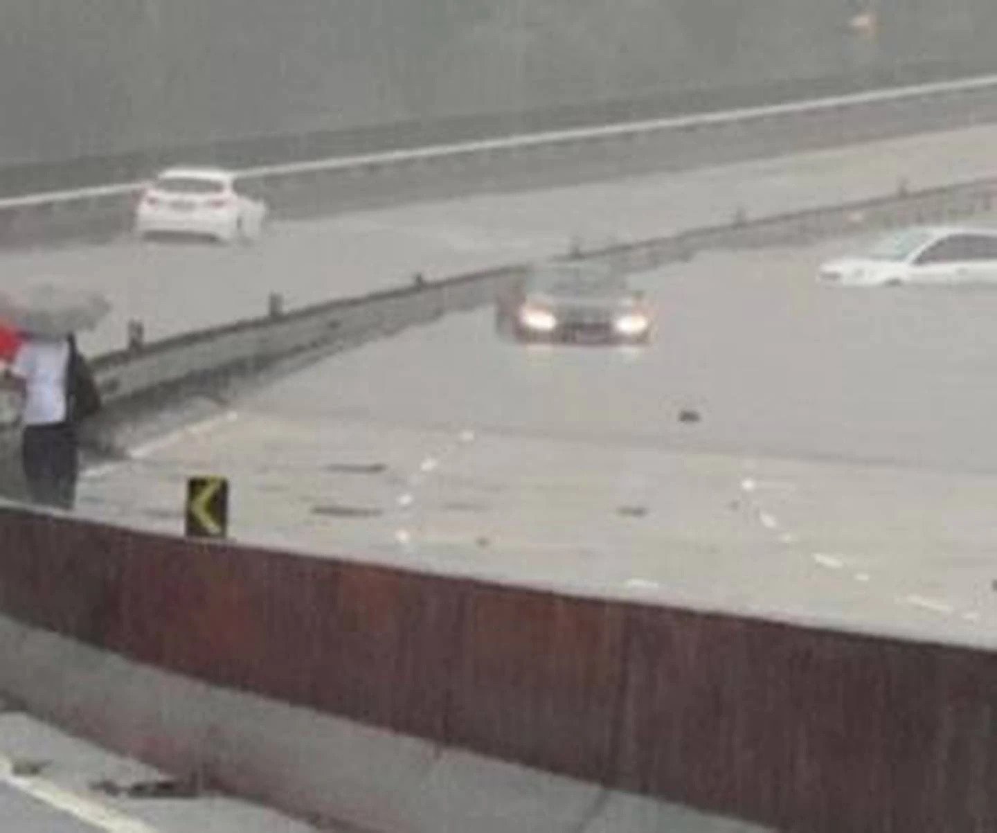 Cars attempting to cross floodwaters on the Roseville Bridge were left stranded. Photo / Facebook