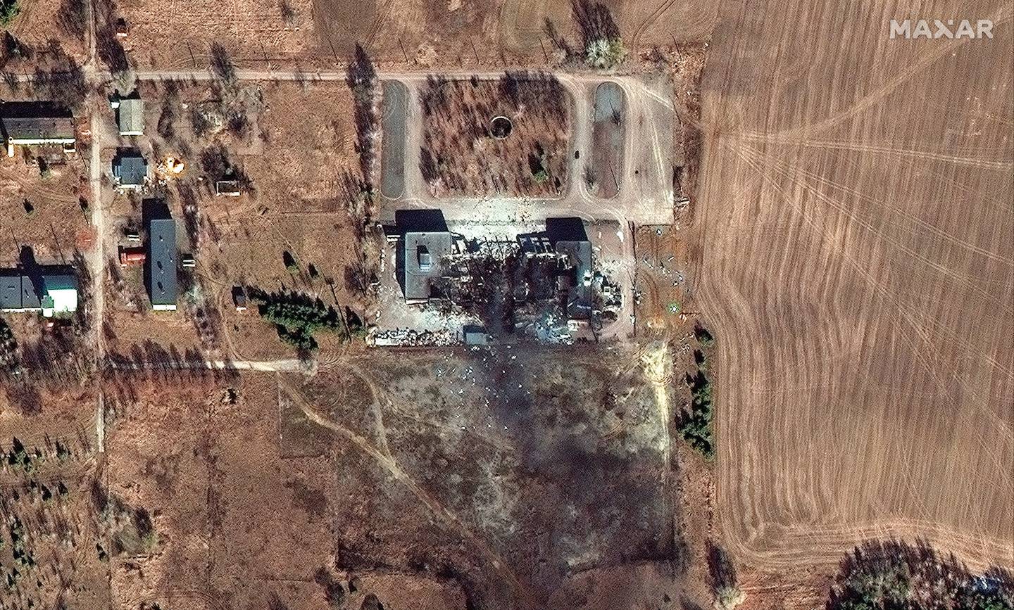 This satellite image provided by Maxar Technologies shows a close up of destroyed factory building west of Chernihiv, Ukraine. Photo / APÂ