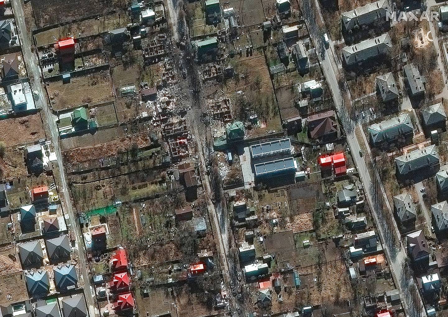 This satellite image provided by Maxar Technologies shows a close up of destroyed military vehicles and homes at a residential area south of Antonov airport in Bucha, Ukraine. Photo / APÂ