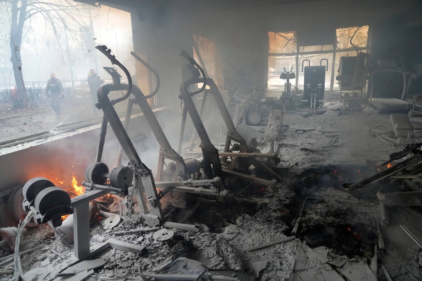 Flames and smoke rise from a damaged gym following shelling in Kyiv, Ukraine. Photo / APÂ