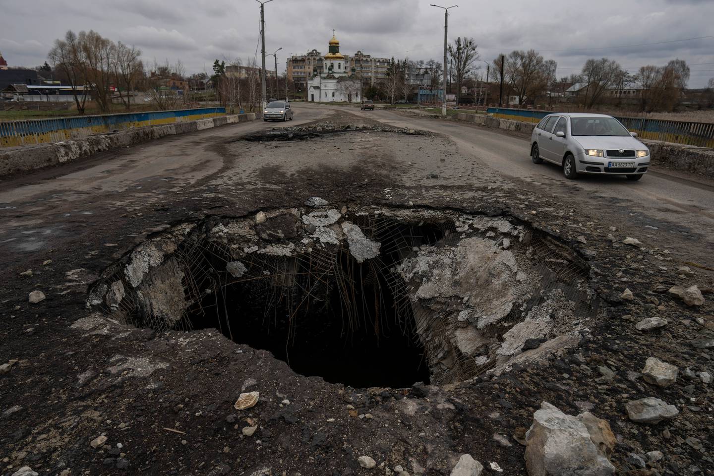 Cars drive near a damaged bridge following a Russian attack in the previous weeks in the town of Makarov, Kyiv region, Ukraine, on April 10. Photo / APÂ
