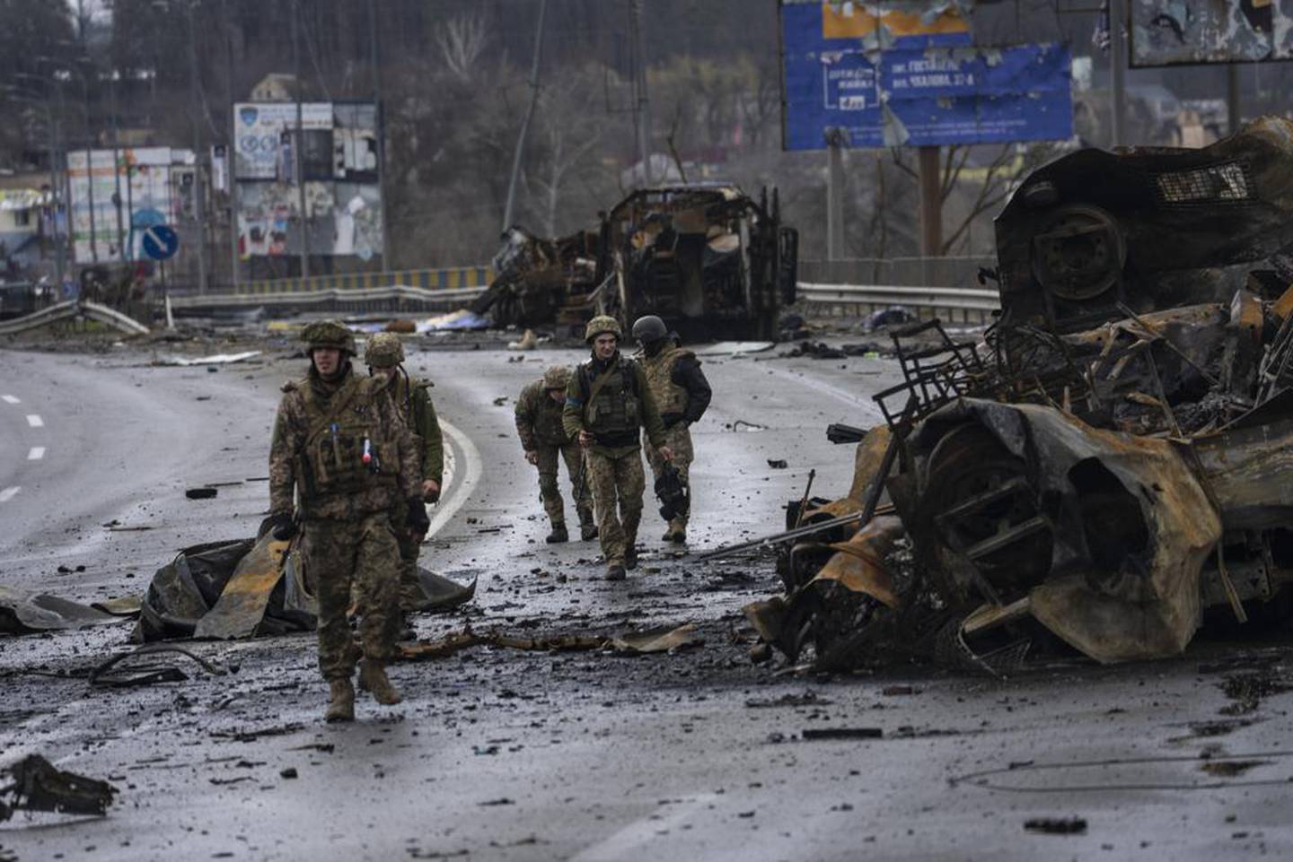 Ukrainian soldiers walk next to destroyed Russians armored vehicles in Boucha, Ukraine, Saturday, April 2, 2022. Photo / APÂ
