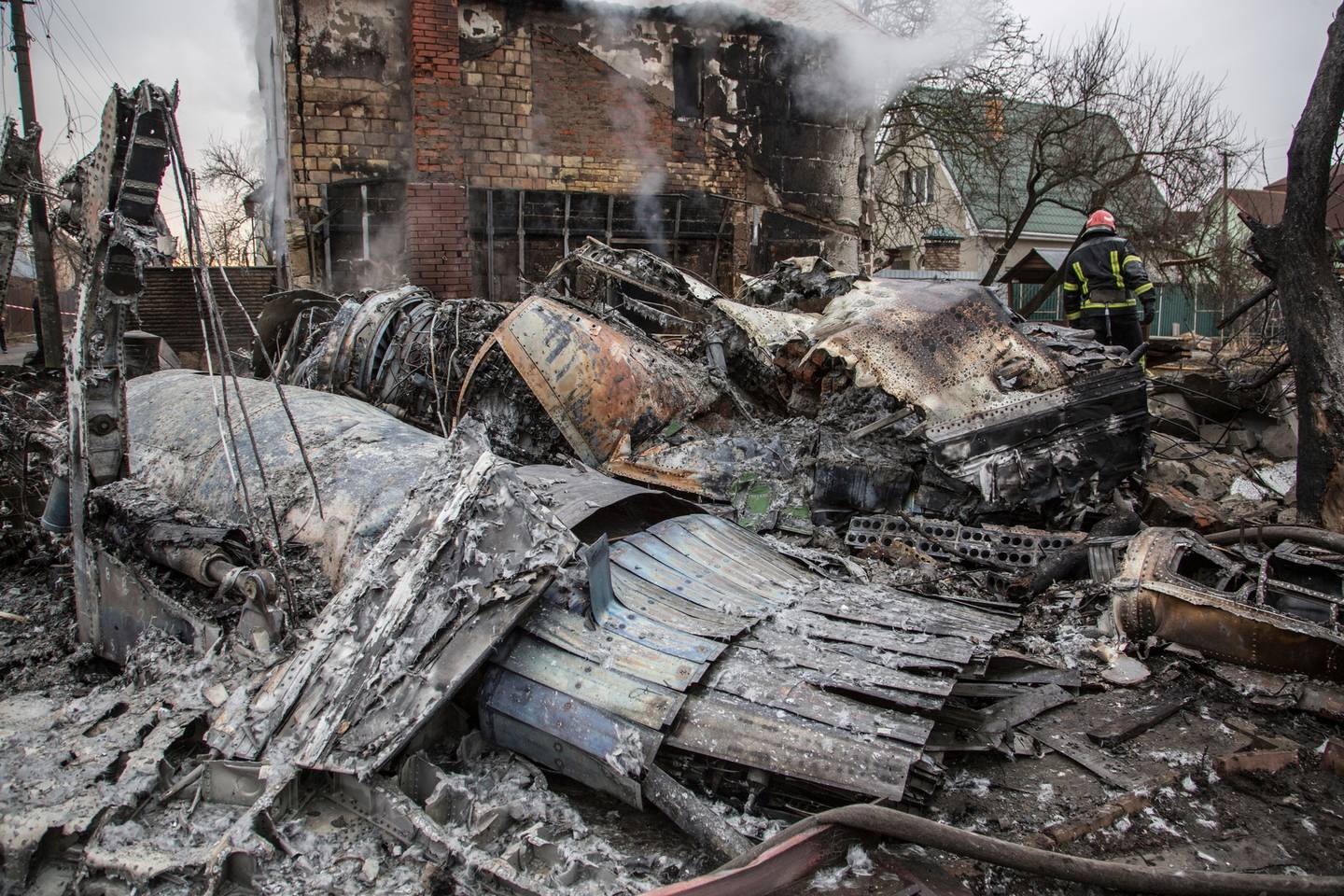 A Ukrainian firefighter walks between at fragments of a downed aircraft seen in Kyiv, Ukraine, on February 25. Photo / AP