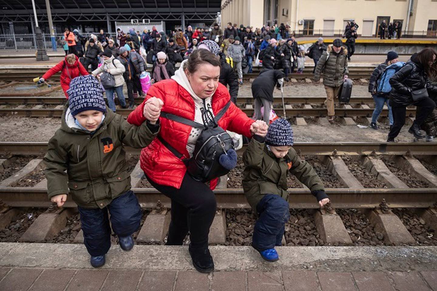 People, mostly women and children, try to get onto a train bound for Lviv, at the Kyiv railway station. Photo / APÂ