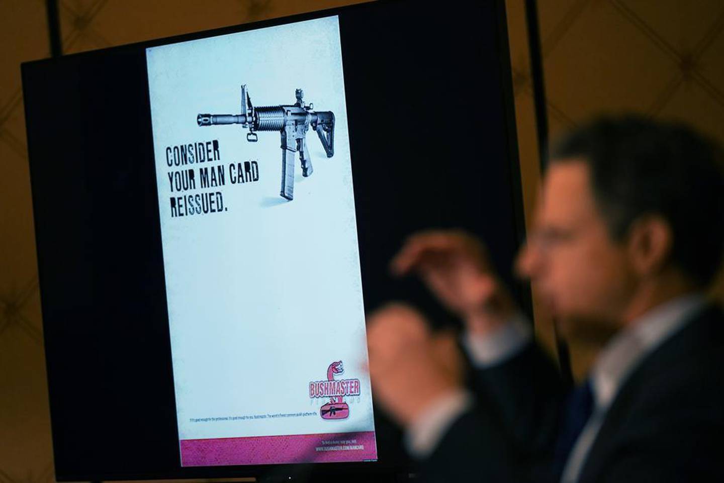 An image of the advertising used for an AR-15-style rifle is displayed while attorney Josh Koskoff speaks. Photo / APÂ