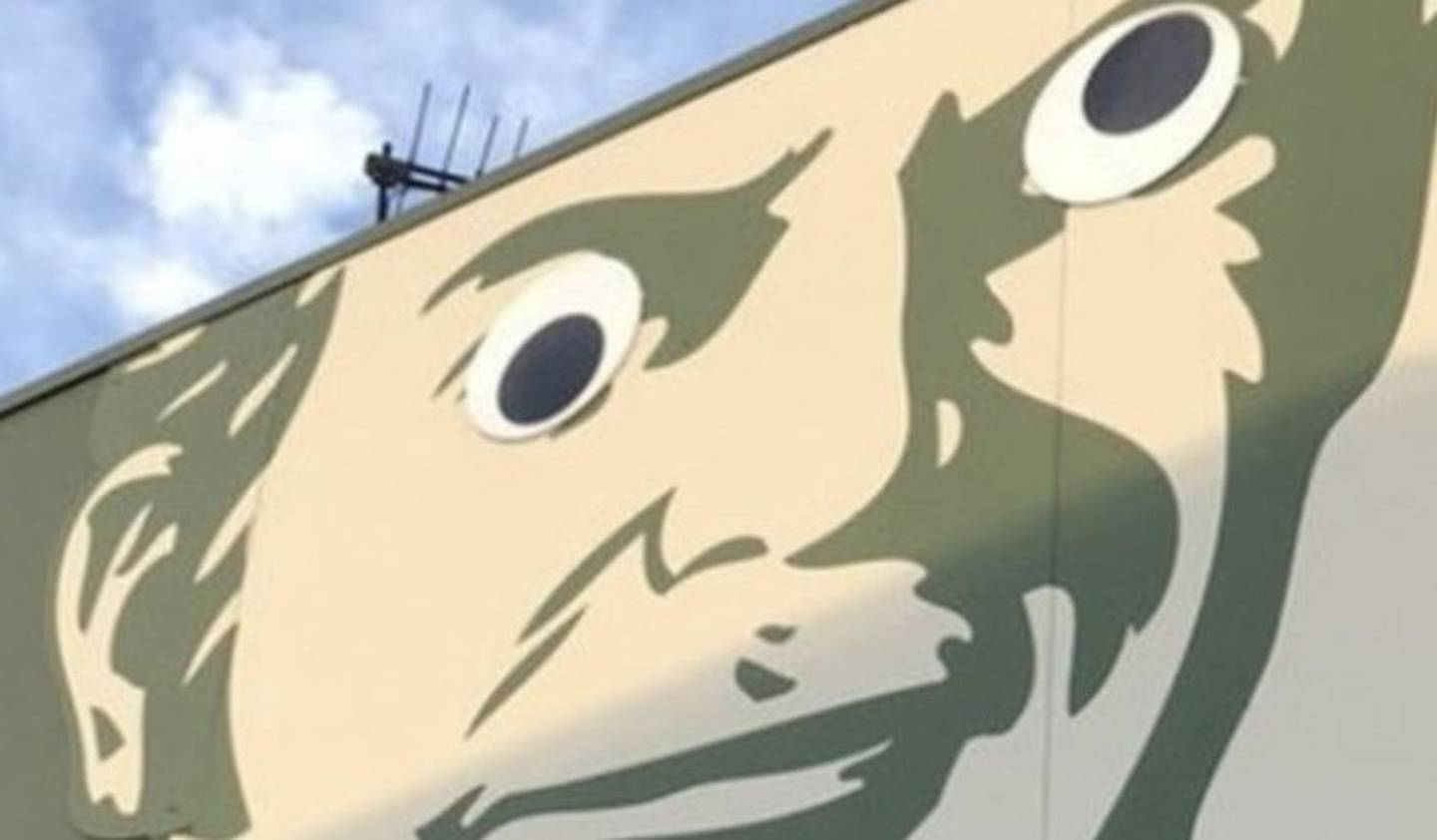 The huge beige and green face on the Dan Murphy's store in Welland now has a pair of googly eyes. Photo / ABC NewsÂ