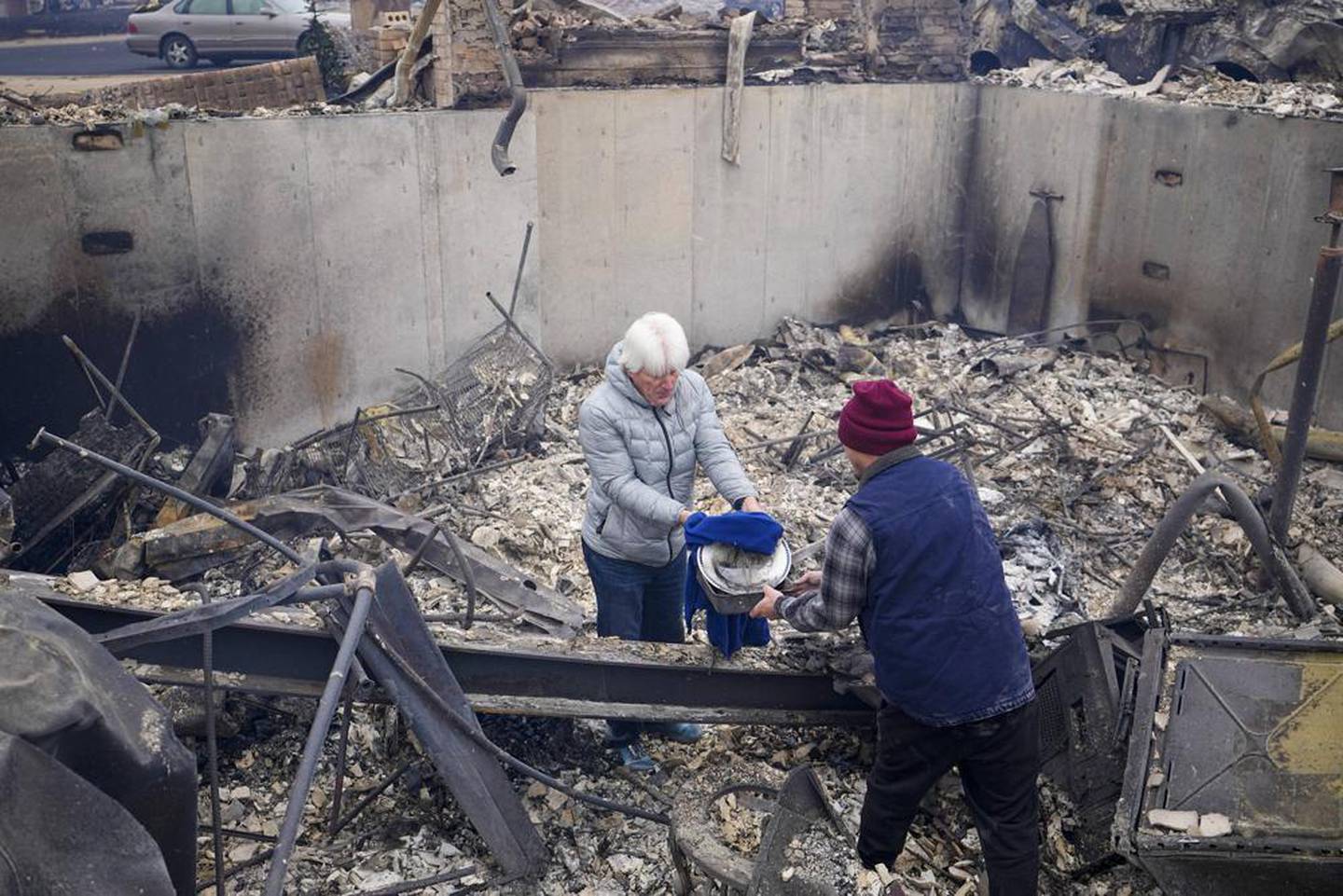 One couple returned home on Friday to find the mailbox about the only thing left standing. Charred cars and a burned trampoline lay outside smouldering houses. On some blocks, homes reduced to smoking ruins stood next to ones practically unscathed by the flames.Â