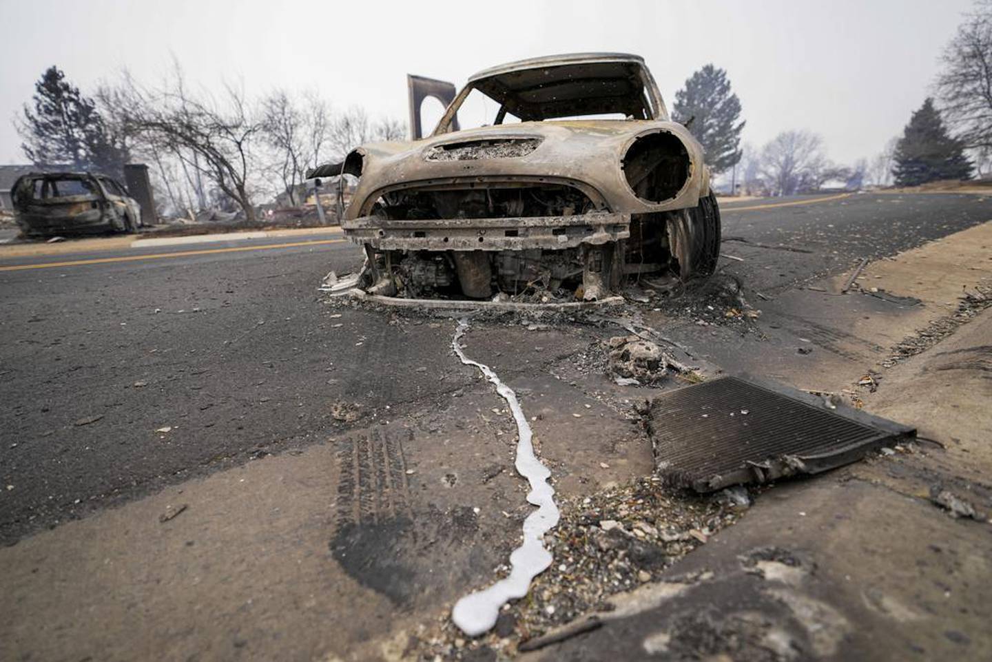 A burned-out car sits on Mulberry St, destroyed by the Marshall wildfire. Photo / APÂ