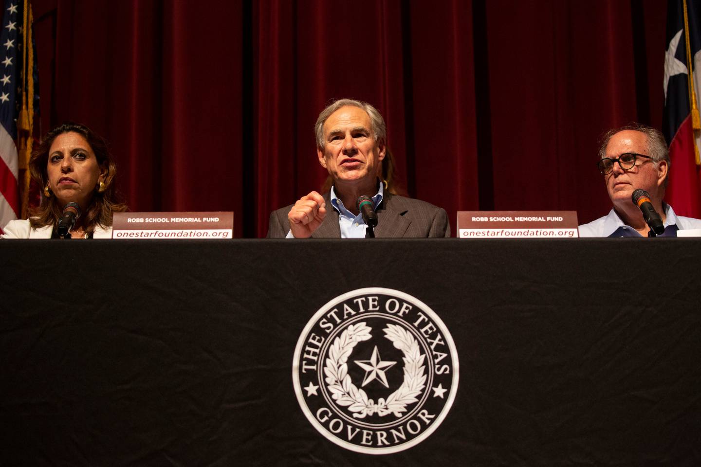 Texas Governor Greg Abbott at a news conference about the school shooting. Photo / APÂ