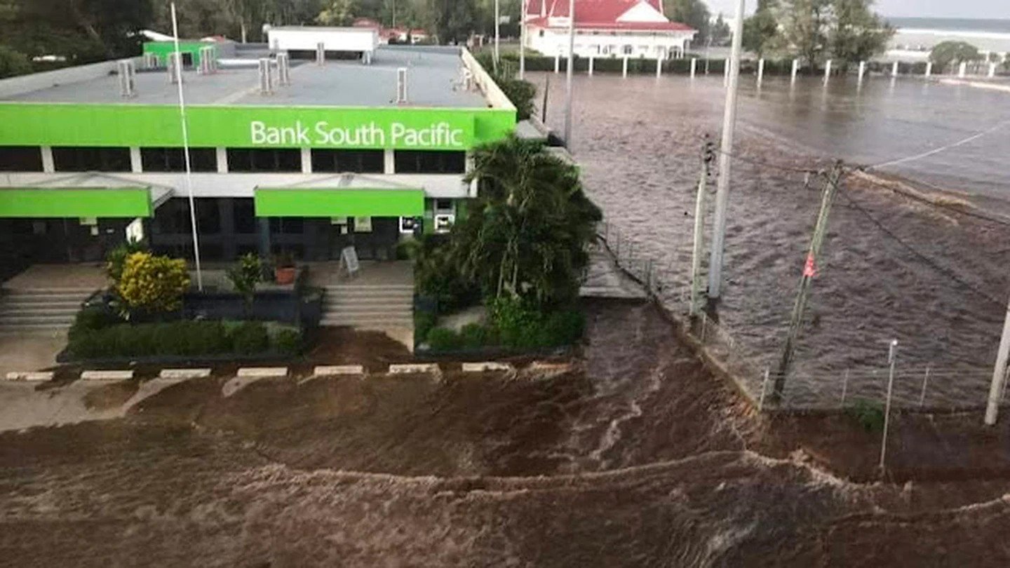 Tongan King's palace in the background as the streets are flooded by the tsunami waves. Photo / SuppliedÂ