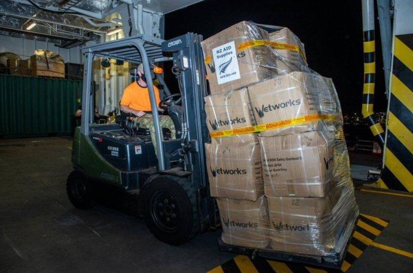 Golding said the team onboard the Aotearoa had successfully offloaded five containers of stores and spent Saturday offloading bulk water supplies to be distributed across the island.Â