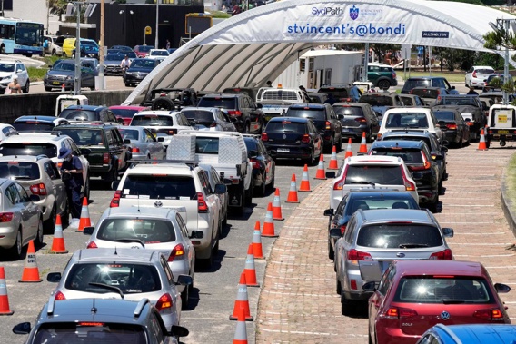 Cars line up at a drive-through Covid-19 testing clinic at Bondi Beach in Sydney before Christmas. Photo / Getty ImagesÂ