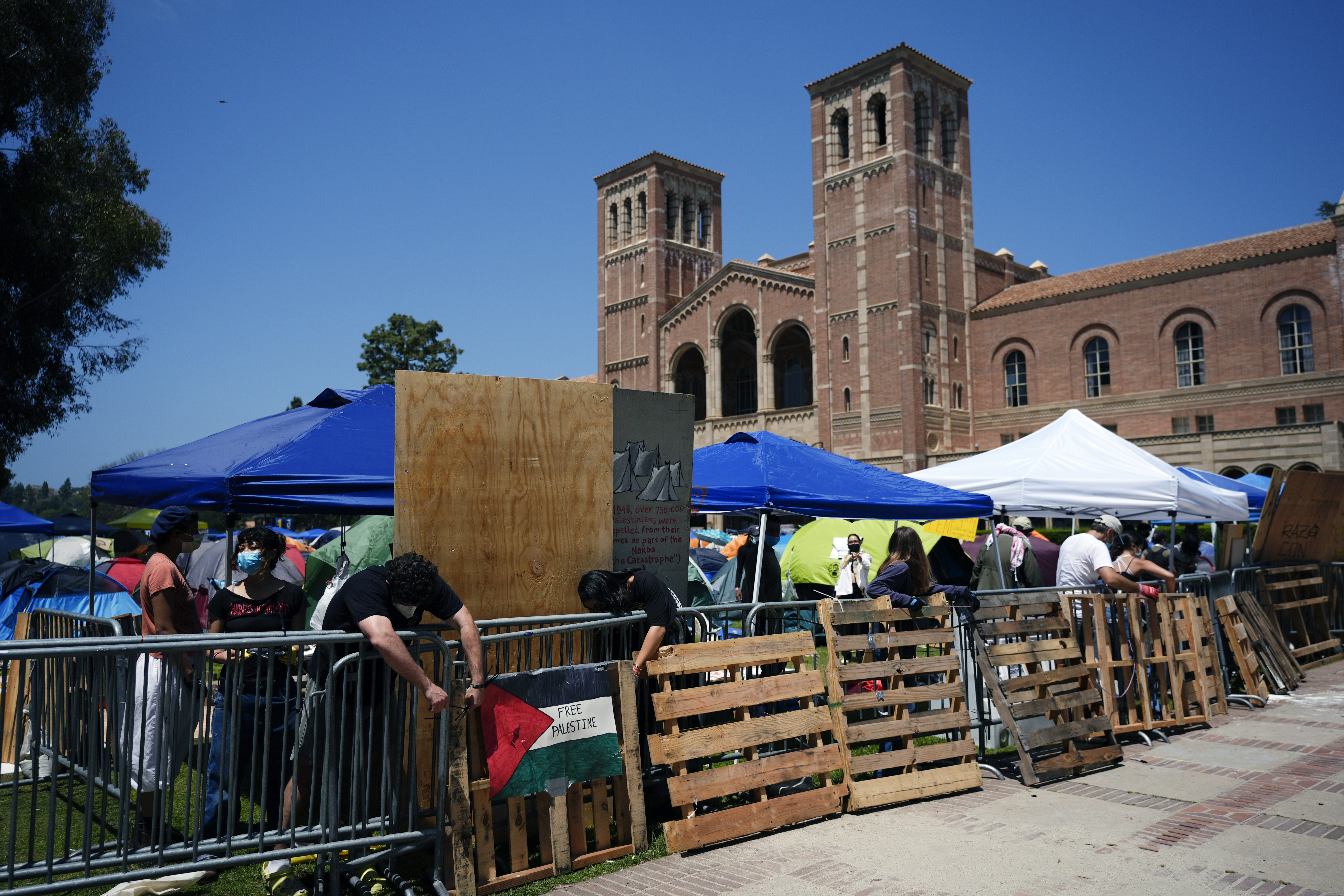 Demonstrators restore a protective barrier at an encampment on the UCLA campus, the morning after clashes between Pro-Israel and Pro-Palestinian groups, Wednesday, May 1, 2024, in Los Angeles. (AP Photo/Jae C. Hong)
