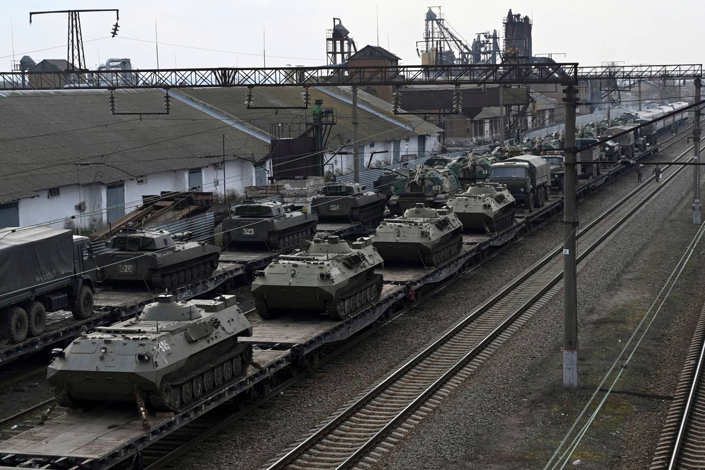 Russian armoured vehicles are loaded onto railway platforms at a railway station in the region not far from the Russia-Ukraine border. Photo / AP