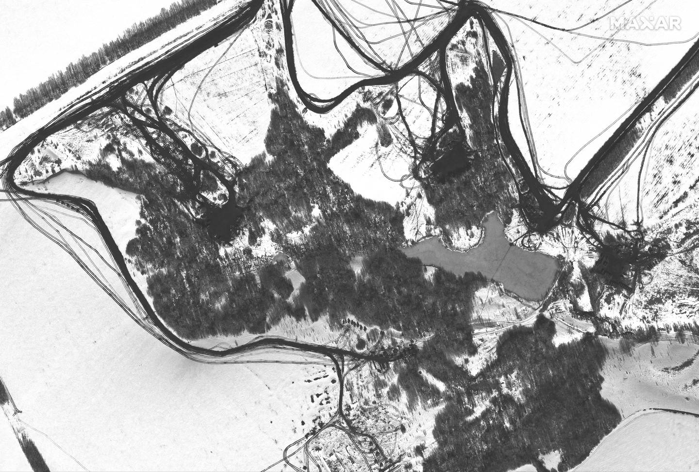 The satellite image provided shows artillery, troops and logistics deployment near the town of Malakeevo, Russia, approximately 20 miles from the Ukraine border. Photo / Maxar Technologies