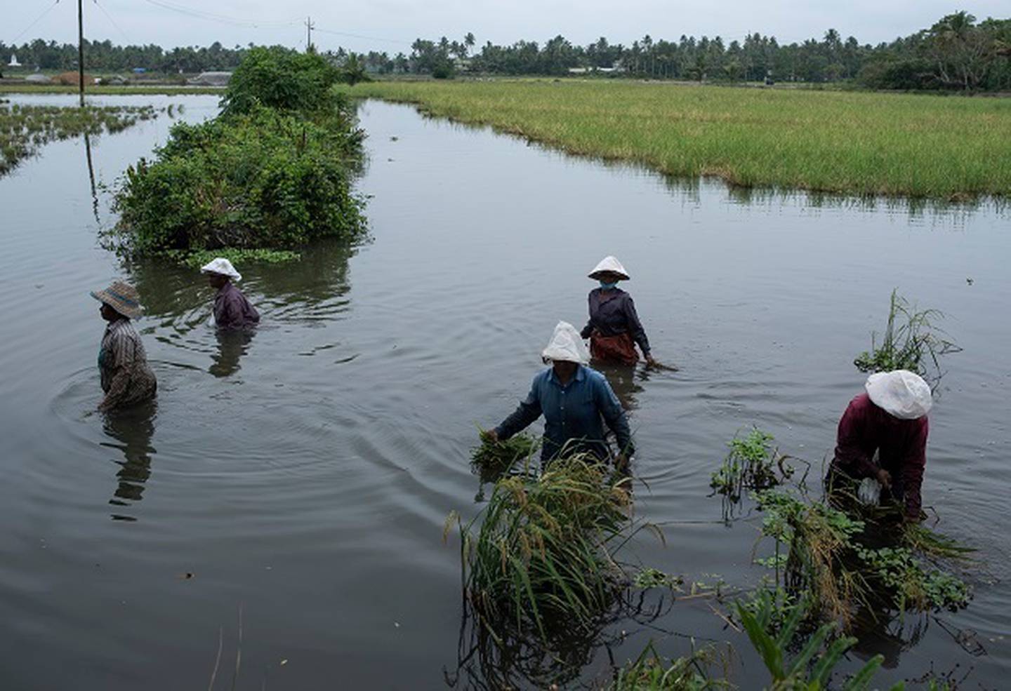 Women wade through waist-deep water to harvest paddy cultivated as part of the Pokkali farming system in Kochi, India. Photo / APÂ