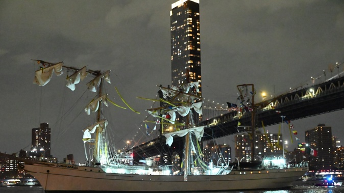 The white-hulled ship was moored on Sunday along the banks of the East River, its mangled masts contrasting against colourful decorations for its US departure.