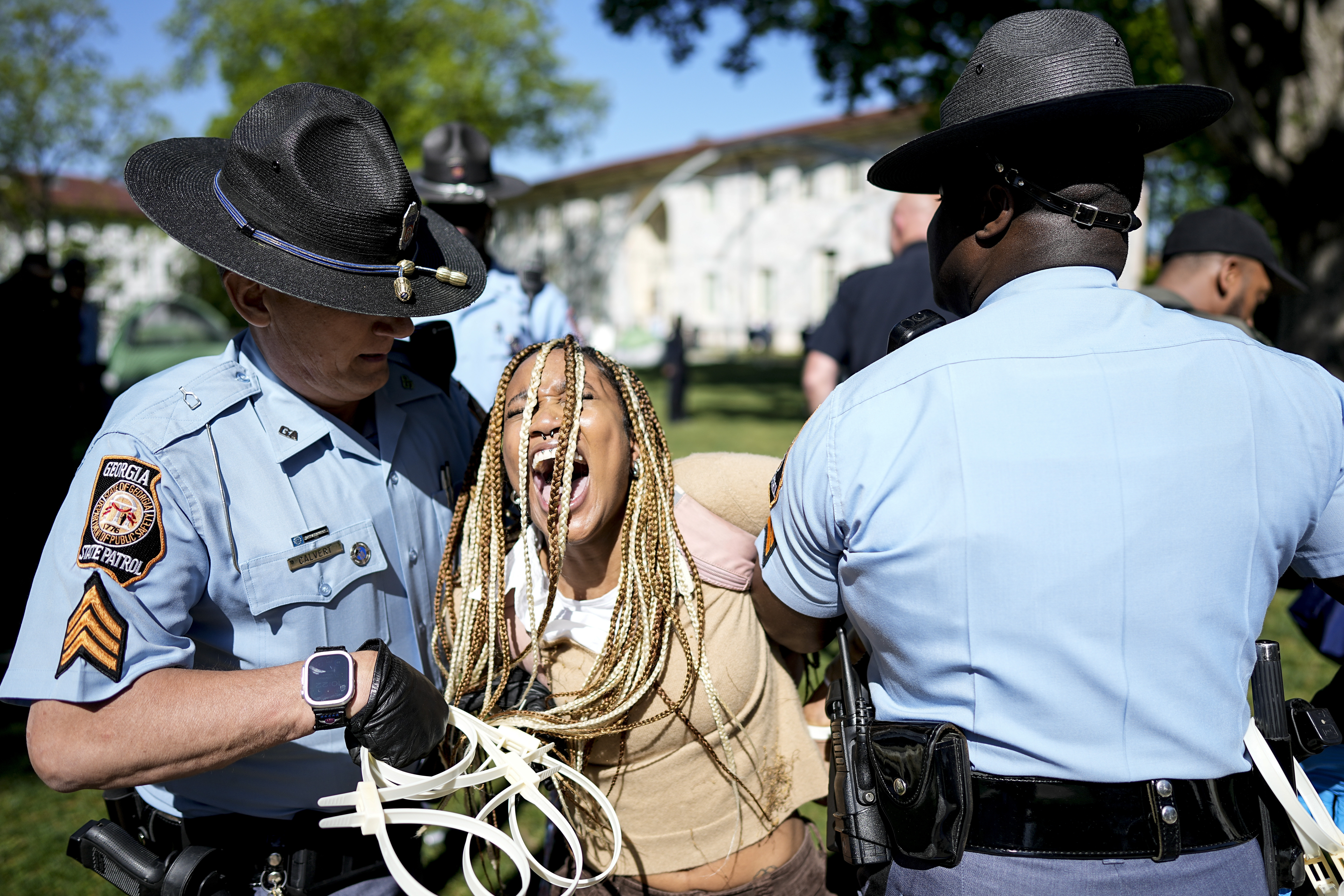 Georgia State Patrol officers detain a demonstrator on the campus of Emory University during a pro-Palestinian demonstration, Thursday, April 25, 2024, in Atlanta. (AP Photo/Mike Stewart)Â