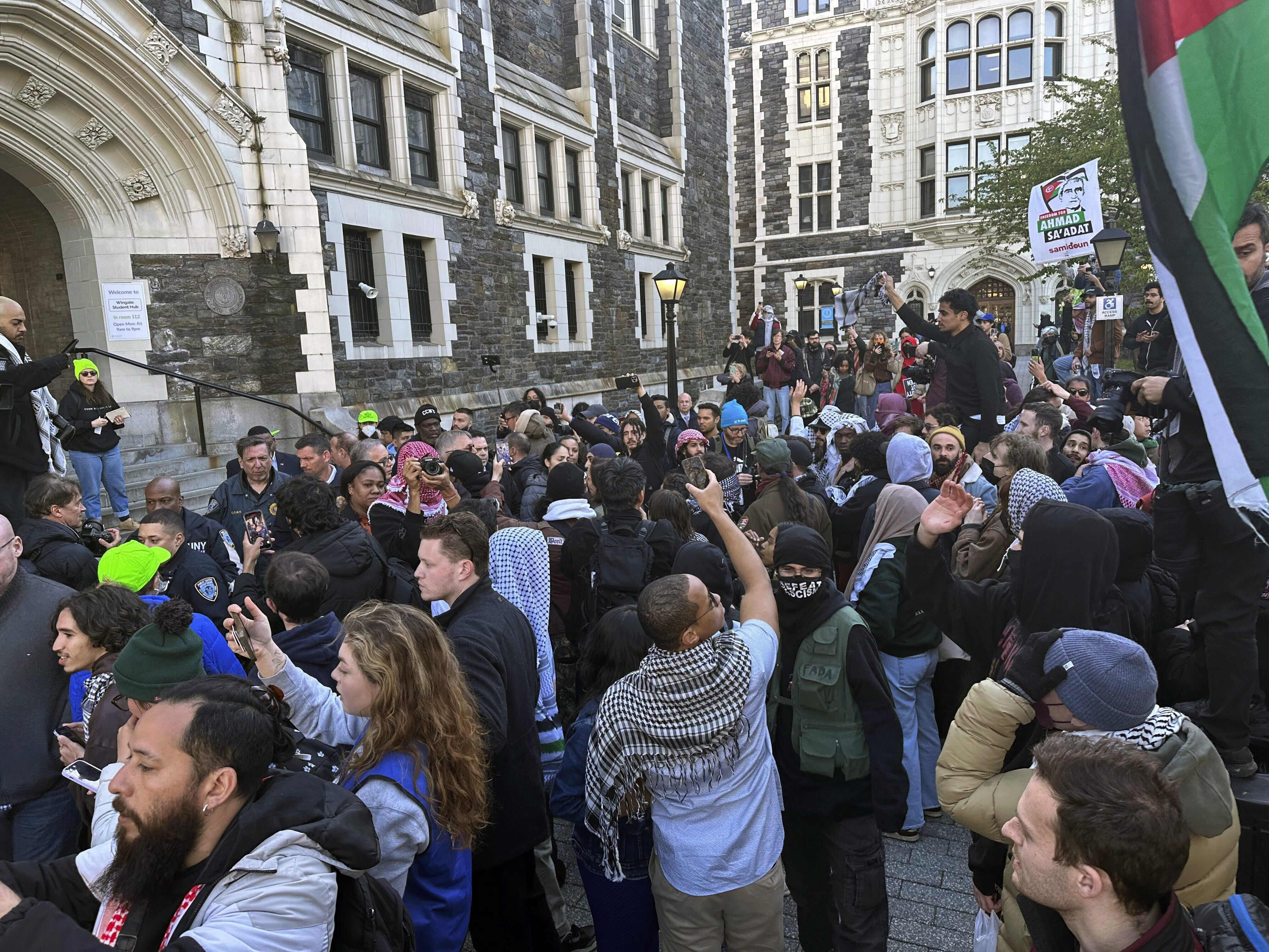 At Emerson College in Boston, 108 people were arrested overnight at an alleyway encampment. Video shows police first warning students in the alleyway to leave. Students linked arms to resist officers, who moved forcefully through the crowd and threw some protesters to the ground.Â