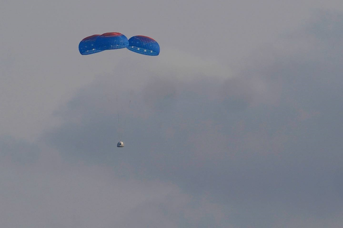 Blue Origin's New Shepard capsule parachutes safely down to the launch area after a brief trip to space Photo / AP