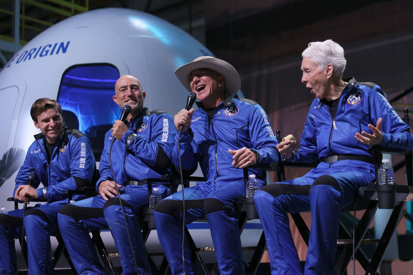 Blue Origin's New Shepard crew Oliver Daemen, Mark Bezos, Jeff Bezos, and Wally Funk hold a press conference after flying into space. Photo / Getty
