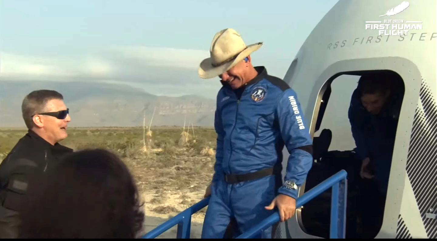 Led by Bezos, they climbed out of the capsule after touchdown with wide grins, embracing parents, partners and children, then popped open bottles of sparkling wine, spraying one another.
