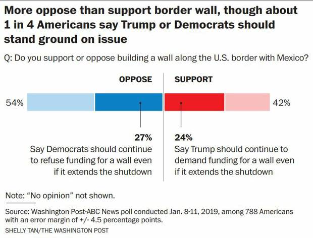 Support for building a wall on the border, which is the principal sticking point in the stalemate between the president and Democrats, has increased over the past year. Today, 42 per cent say they support a wall, up from 34 per cent last January. A slight majority of Americans (54 per cent) oppose the idea, down from 63 per cent a year ago.