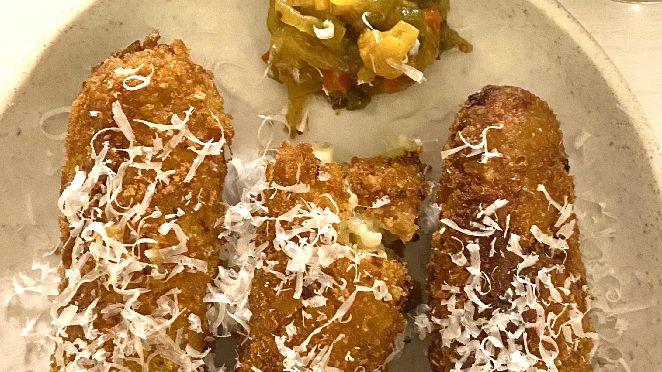 5. Begin to shape the croquettes by rolling tablespoonfuls of the cooled béchamel into small sausage shapes. Roll each one in flour, then egg, then in the breadcrumbs and set aside.Â