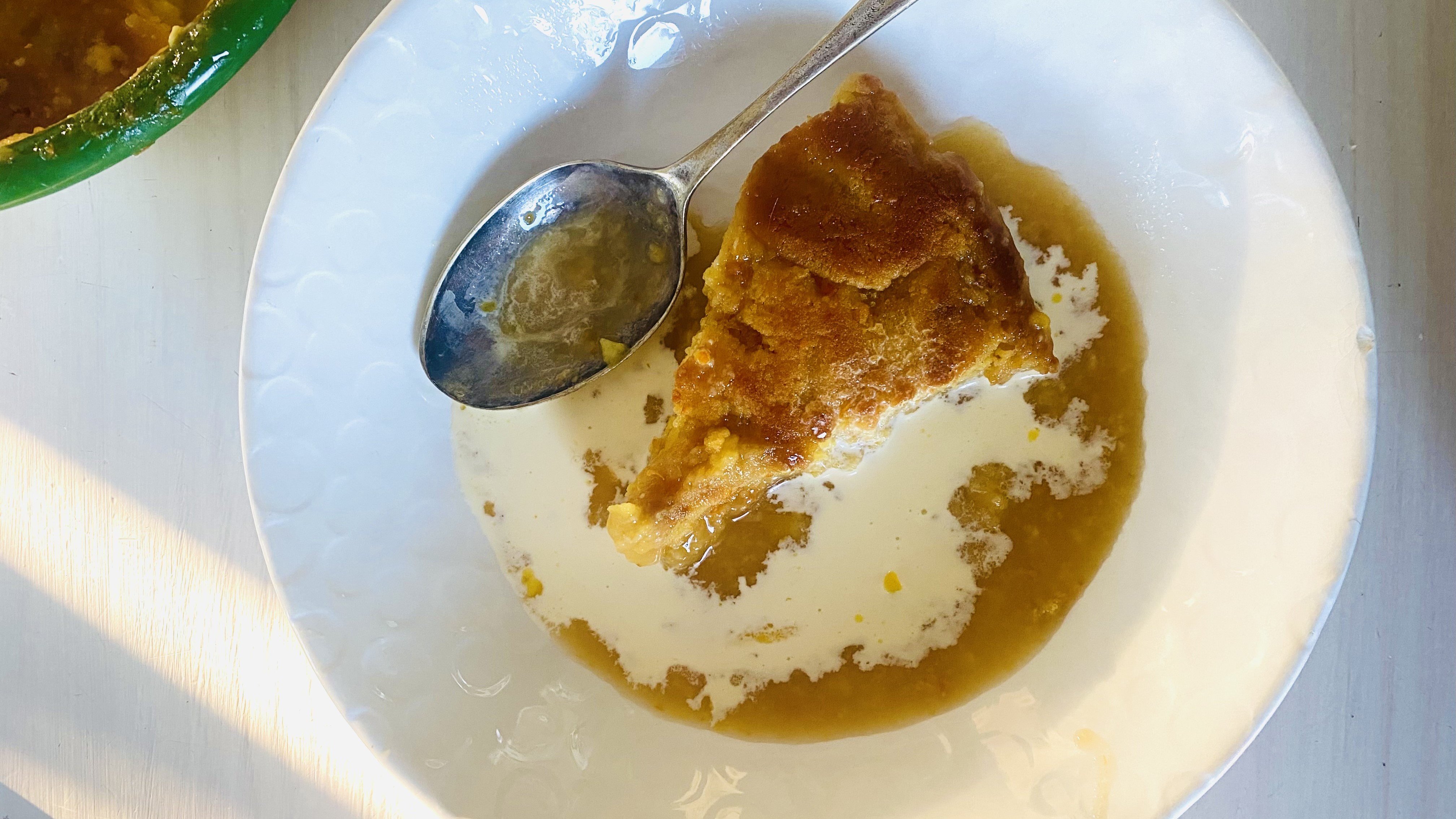 In a bowl, whisk egg with sugar. Add in the melted butter & whisk. Blitz half the orange —skin and all— until it’s pulped then stir this in. Add in flour, baking powder and almonds. Stir until combined. Add in 1-2 tbsp milk if it’s too stiff. Scrape batter into the greased dish.  In the batter bowl (scraped clean) mix the boiling water, brown sugar, butter, cornflour and juice from the remaining half orange. Gently pour this over the batter. Bake for 40 mins, or until cake bit is cooked through. Â