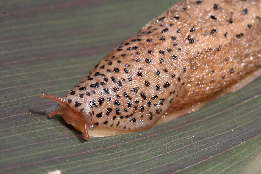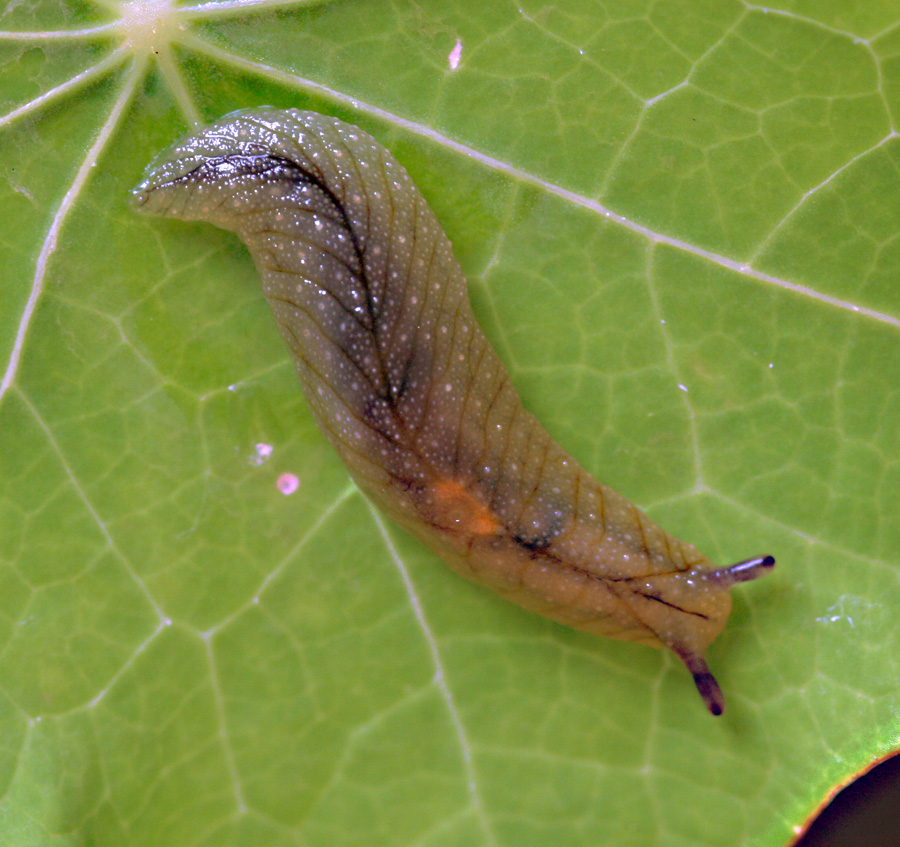 Limax maximus (literally: “the largest slug”) also known as the leopard slug. Introduced into New Zealand and has a habit of getting inside our homes, especially when there’s a cat with milk in its bowl. The slurping by this slug can be heard by the neighbours!