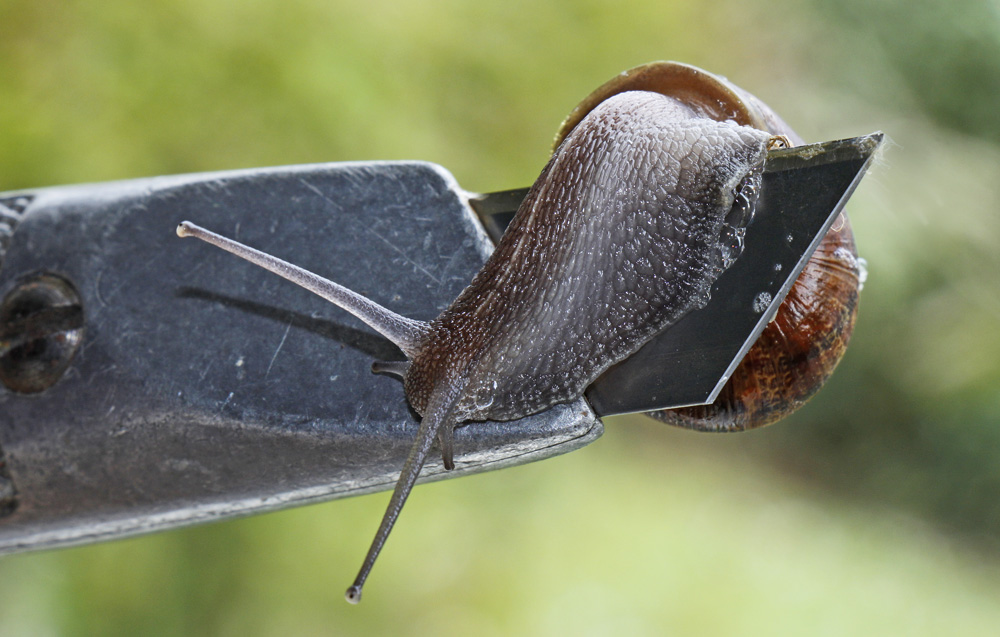One of the so-called “control” measures is spreading sharp chicken eggshells around the plants, so that the snails can’t walk over those sharp items. This picture shows one of those snails crossing over a brand-new, super sharp knife…