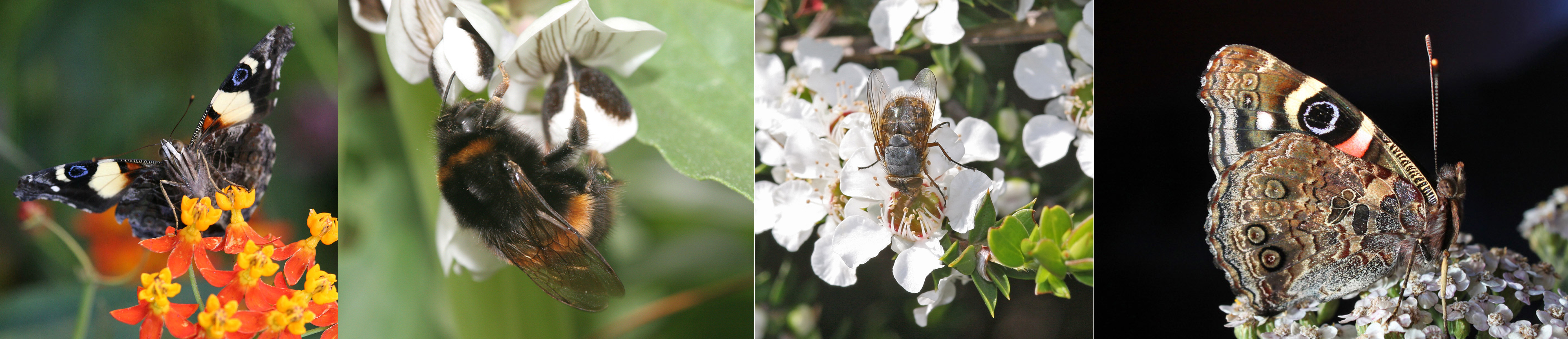 Here’s a line-up of all sorts of pollinators in the group of insects. For the flowers pollinated by insects, especially bees, it’s interesting to note that they have different colour vision to humans. Blue, green, violet and ultra-violet are the key colours.