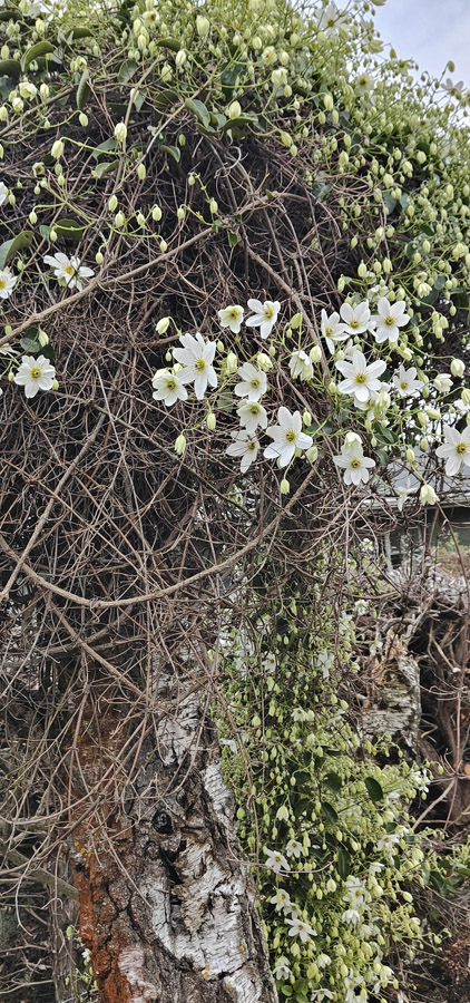 I planted our Clematis some 6 years ago near the base of a dying old Birch tree. That birch literally karked it in the next six months, so it was the perfect tree for the climber to climb on.